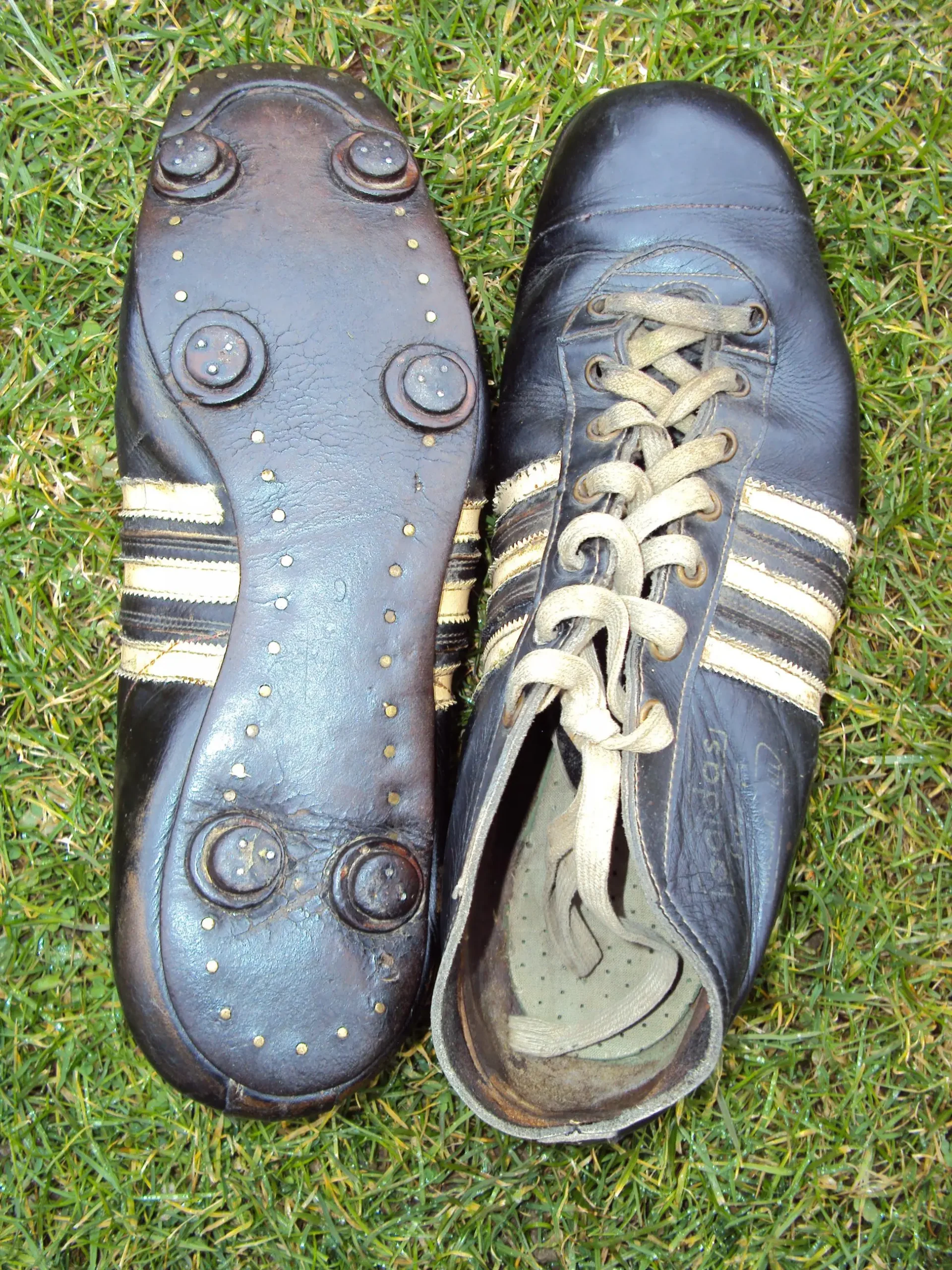 ![]() Foto: Franz Holzmeier | Für Farbe der einst einheitlich schwarzen Fußballschuhe der Marken „Adidas“ oder „Puma“ sorgen inzwischen die in allen Farben und aus unterschiedlichsten Materialien hergestellten „bunten“ Schuhe, bedeuten aber noch lange keine Garantie auf Tore und Punkte! Der einzige Unterschied bei den damaligen Schuhen bestand darin, dass man im Sommer etwas kürzere „Lederstollen“ einschraubte, und sie bei tieferem Boden durch 16 mm lange „Alu-Stollen“ ersetzte, – denn wer hatte schon das Geld, für zwei verschiedene paar Fußballschuhe! Diese Schuhe (der Marke Eigenbau) gehörten einst dem Sattlermeister und 2023 verstorbenen FSV-Ehrenmitglied Franz Schrettenbrunner mit denen er in den 60-iger Jahren als Mittelfeldspieler (Halbstürmer) und Mannschafts-Kapitän sein Team auf den Platz führte! Ob heutzutage ein Fußballer wohl damit noch spielen würde, bzw. könnte? |