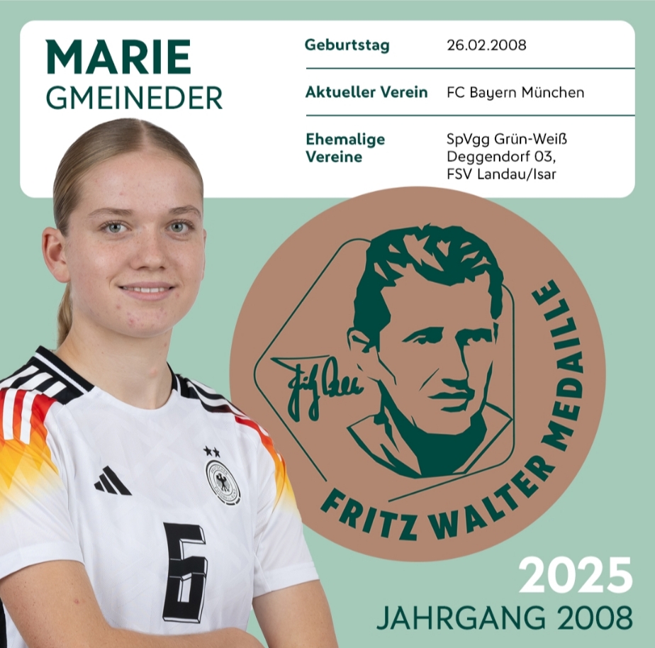 Große Ehre für Marie Gmeineder: Marie Gmeineder, ehemalige Jugendspielerin des FSV Landau und derzeit in der zweiten Mannschaft des FC Bayern München aktiv, wurde vor kurzem durch den Deutschen-Fußball-Bund (DFB) mit der Fritz-Walter Medaille in Bronze ausgezeichnet.